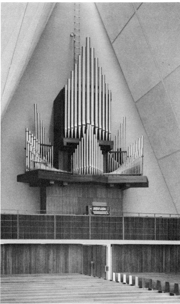 This was Schlicker's first major commission for a University, and resulted in a steady number of commissions thereafter, largely for universities in the mid-west, and Lutheran colleges and churches in particular, most notably St. Olaf in Minnesota and Valaraiso University in Indiana. This large A-frame chapel was designed by the eminent architectural firm Eero Saarinen & Associates, also favored by Lutheran denominations from the late 50s and through the 1960s. The organ was designed by Herman Schlicker in collaboration with Dean Carl Halter and consultant Paul Bunjes of Concordia Teacher's College, River Forest, Illinois. Bunjes would go on to become a frequent collaborator with the Schlicker company in particular, designing instruments in an extreme neo-baroque style, and who was the author of a substantial treatise on "The Praetorius Organ" in the late 1960s for which Schlicker built a display organ with sample pipes built to supposed Praetorian specifications with extremes in scaling between male (narrow) and female (wide) scaling diameters. The Kramer Chapel organ was subsequently altered by Roderer, Noack, and Buzard, with a new solid-state console by Noack and Terrill in the 1990s.