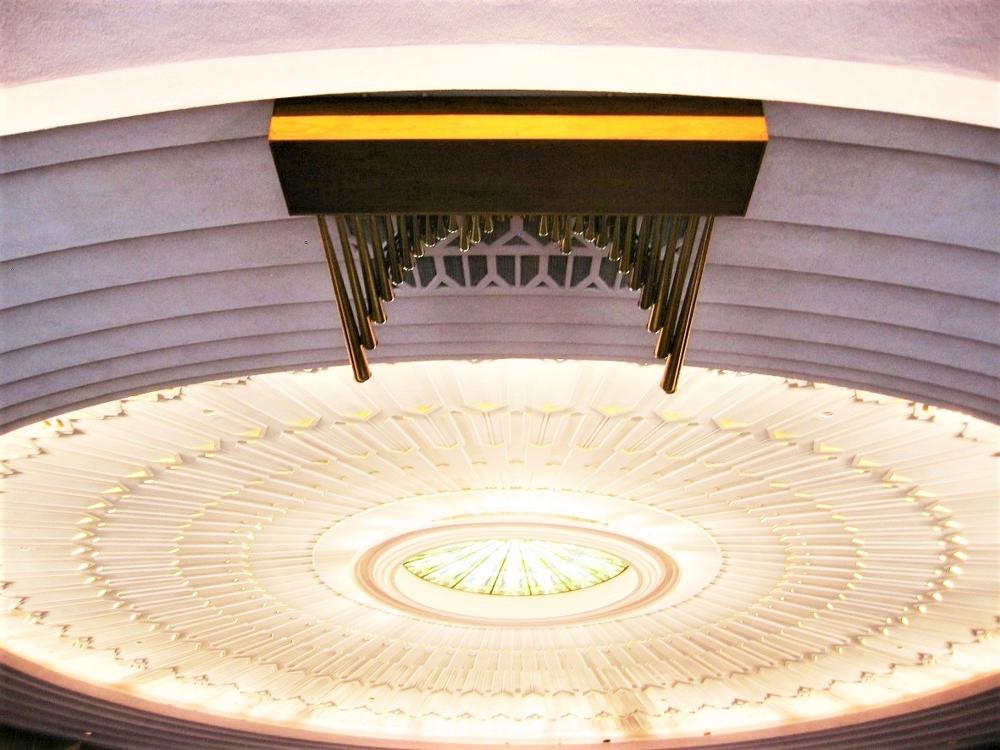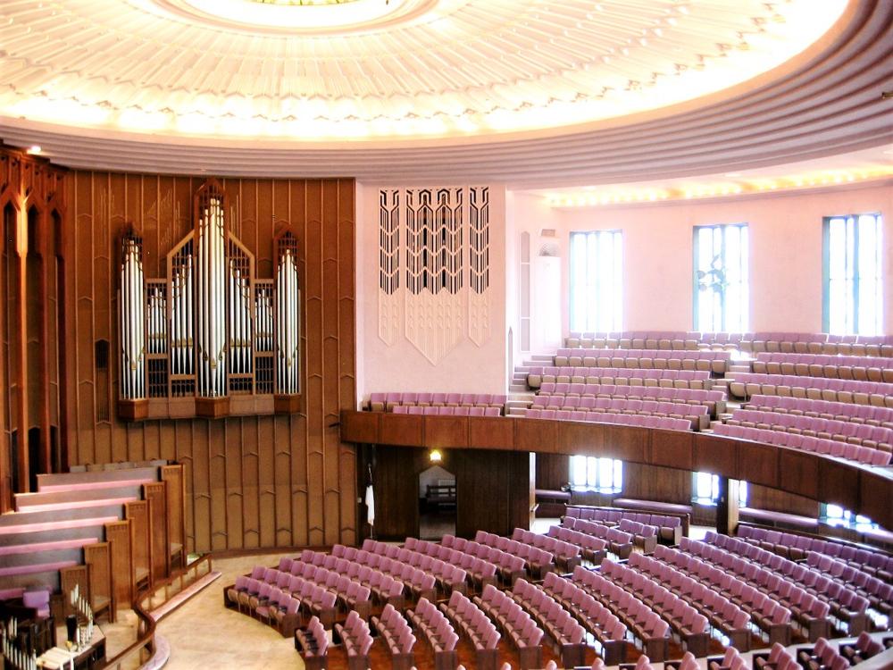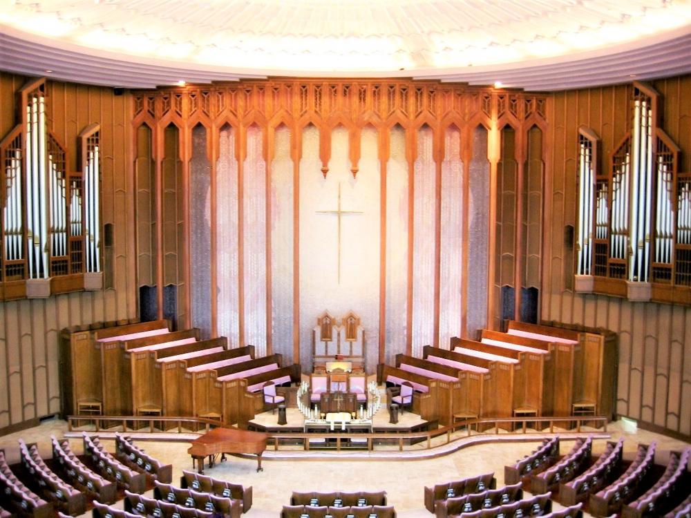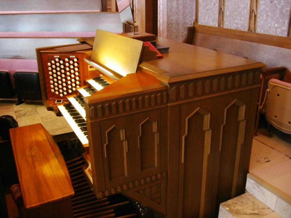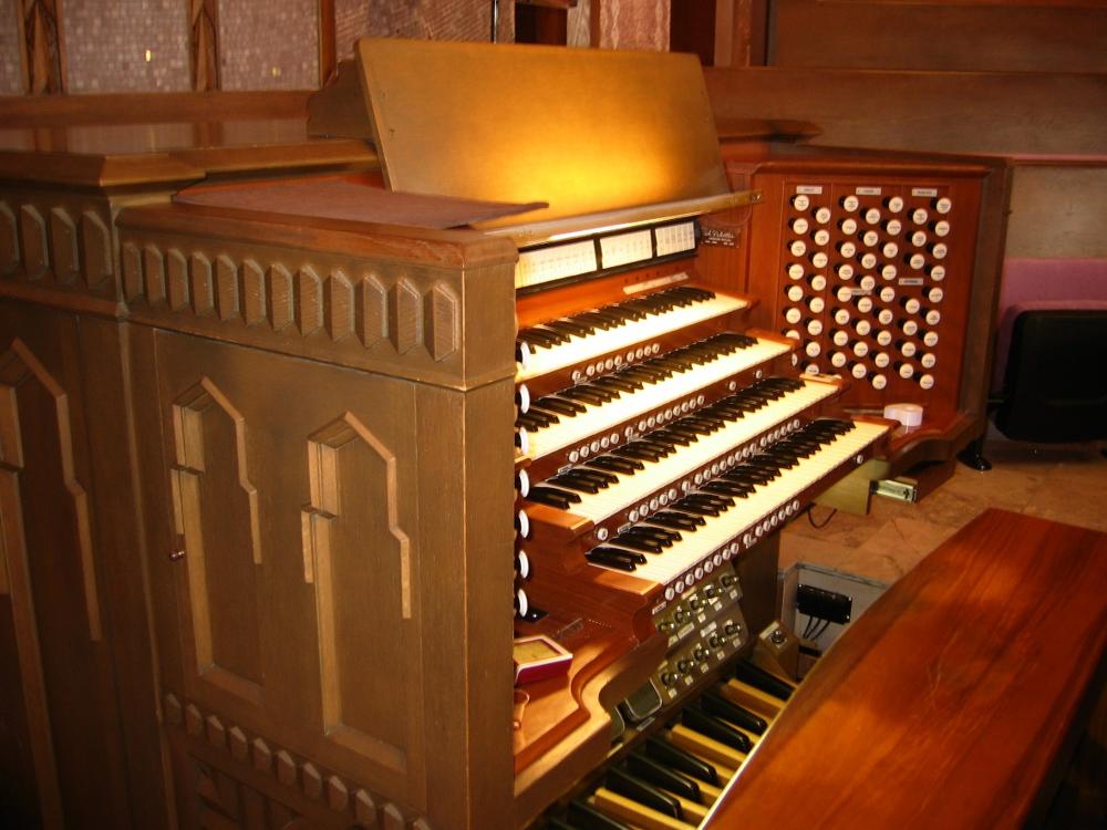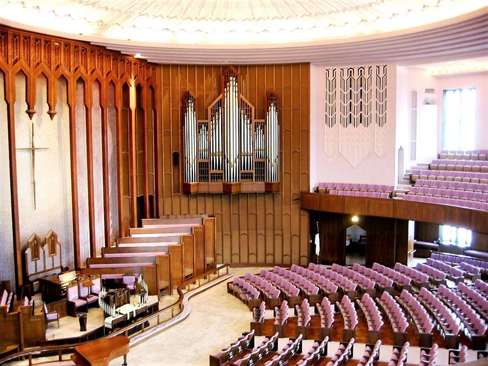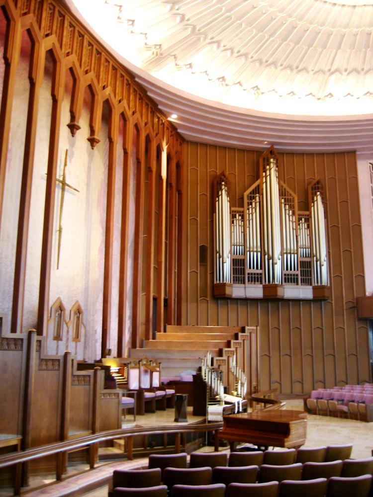 Identified through online information from Philippe Beaudette. -- In November of 1986, the Administrative Board approved a $400,000 expansion and improvement project for the existing 1961 Möller organ, to be carried out by the M. P. Möller Company. (In 1962 the 32' Bourdon had been installed and three years later the 32' Posaune was added.) Exposed pipes were added in the sanctuary and a new four-manual console featured electro-pneumatic action and solid state combination action. The organ was enlarged to 73 stops, 105 ranks, and 5,869 pipes including the Trompette-en-Chamade located in the ceiling above the balcony.In 1995 a tonal revision project was begun with Daniel Angerstein of Grand Rapids, Michigan. This project was completed in 1999 with the addition of a new Trompette-en-Chamade.