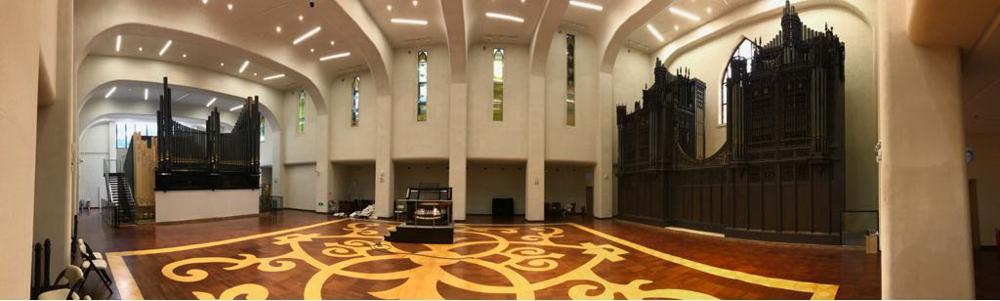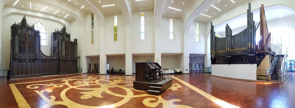 Updated by Antony Melck, representative of the builder.<br> The instrument is divided into the Chancel Organ and the Gallery Organ. Most of the stops of the Chancel and Gallery Swell divisions, and those of the Gallery Choir division, each have 73 pipes for use with the octave couplers.<br>After being bought by Mr Hu Youyi, the organ was moved from Boston, USA, to Gulangyu, China, by Wakeley Pipe Organs, Australia, in 2007; and fully restored by Rieger Orgelbau, Austria, in 2017/8. <br>The two sections of the organ (Chancel and Gallery organs) are positioned at either end of a new, custom-made, hall to simulate the relationship that existed between the organ's sections in the Emmanuel Church, Boston. Both sections have their original facades which have been fully restored with the rest of the organ, including the re-carving of lost sections of the intricate Gallery organ case. The restored console is now on a mobile platform that can be positioned anywhere between the two cases. All the original (thumb and toe) pistons and the accompanying pneumatic system of the console have been retained, but can also be operated by the digital combination system, REA, made by Rieger Orgelbau. This includes a sequencer and playback facility. A keypad for programming the Rieger system is mounted separately on a pedestal next to the organ bench. <br>Thirty-two stops come from the Hutchings instrument; ten stops, that were missing (or replaced with neo-baroque stops in the mid 20th century) have been remade anew by Rieger according to the original specification. <br>The windchests of the organ are original, excluding three off-note chests that were lost when their stops were replaced in the mid 20th century, and which were remade by Rieger. The electrical system and cabling activating the pneumatic chests have been replaced. However, the original electro-pneumatic parts have been retained and stored in the Museum. <br>Following the restoration by Rieger, the organ is once again fully functional as a concert instrument. The restored Gallery organ was inaugurated on 17 December 2017, with Alcee Chriss (USA) as main organist; the complete organ (Chancel and Gallery) was inaugurated on 23 March 2018 with Olivier Latry (France) as organist.