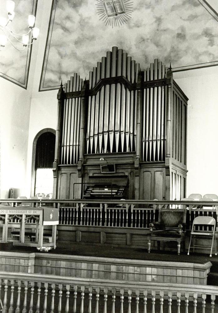 "The Keraulophon is "grooved" to the Stopped Diapason in the bass octave, and the pipes speak at a softer dynamic level. The Octave and Oboe were revoioed about fourteen years ago. The Octave Coupler is operated by an unlabeled hitch-down pedal, and the Water Motor knob apparently never controlled such an engine. The organ was built in Mr. Ryder 's shop in Reading, and it was moved from the former church building to the present edifice in 1890. Details regarding the organ are in *The Boston Organ Club Newsletter* for September, 1965." -- from 1978 OHS Handbook