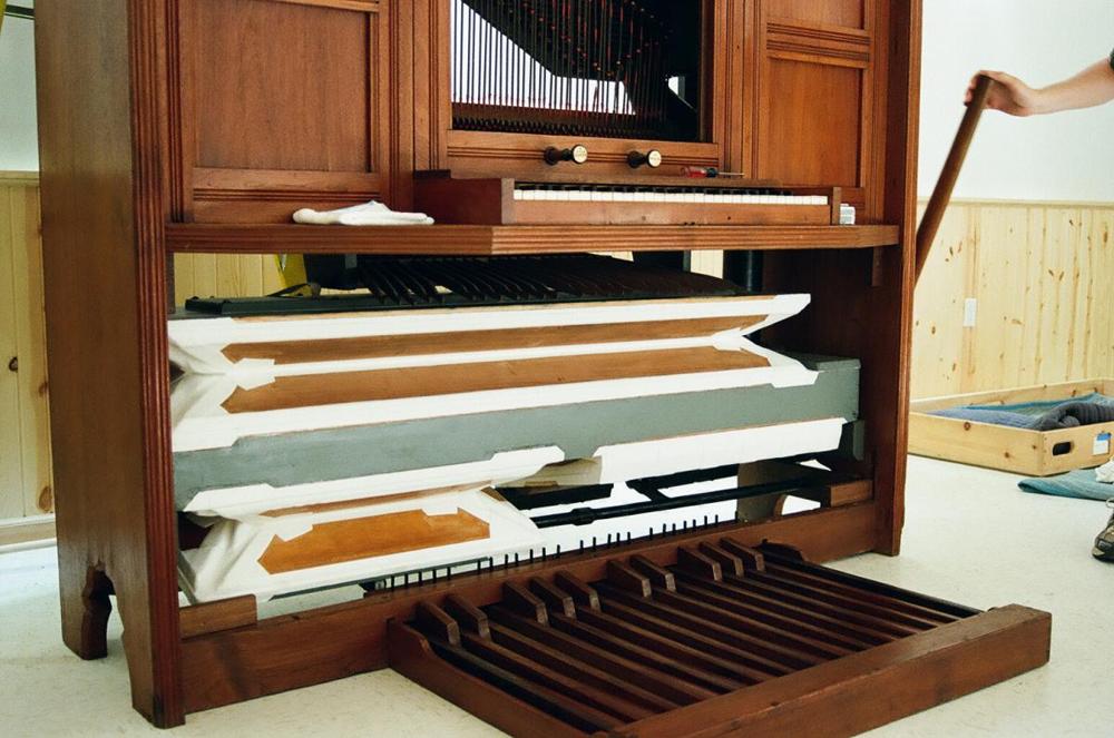 -- Restoration of winding system and relocation of rare "Father" Henry Willis "Scudamore" Organ <br>"Scudamore Organs, or Practical Hints respecting organs for village churches and small chancels, on approved principles" by the Rev. John Baron, M.A. Rector of Upton Scudamore, Wilts; (Wiltshire?) pub. 1858. Baron was a Rector of the Parish of Upton Scudamore; hence, organs designed by English organ builders that fulfilled his requirements were referred to as "Scudamore" organs. <br>This example was built by the Willis firm between 1857 and 1860. The Buzard firm was selected to restore the winding system before installation in the Blue Lake Fine Arts Camp instrument collection. This tracker instrument is still only playable by the hand pumping mechanism. Its organ tone is incredibly lovely.