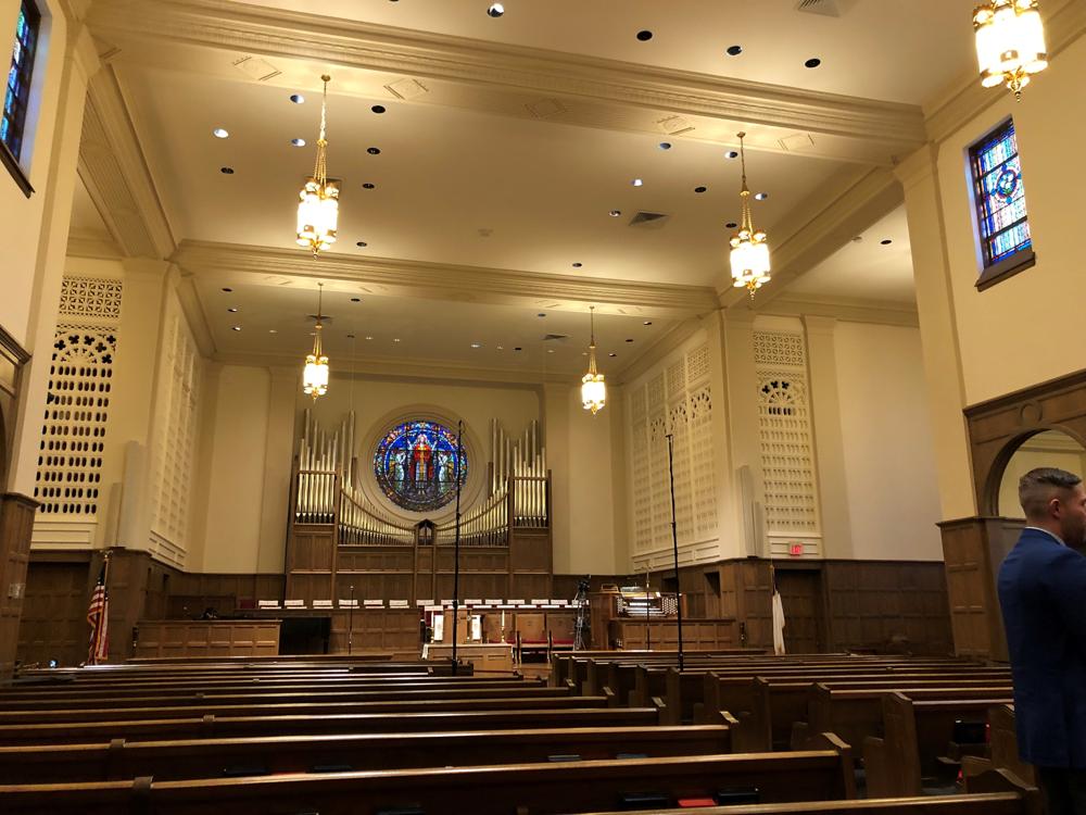 The organ was built in conjunction with a general renovation project during which the acoustics for congregational and choral singing were improved by the replacement of carpet and other absorbent surfaces with firm materials.