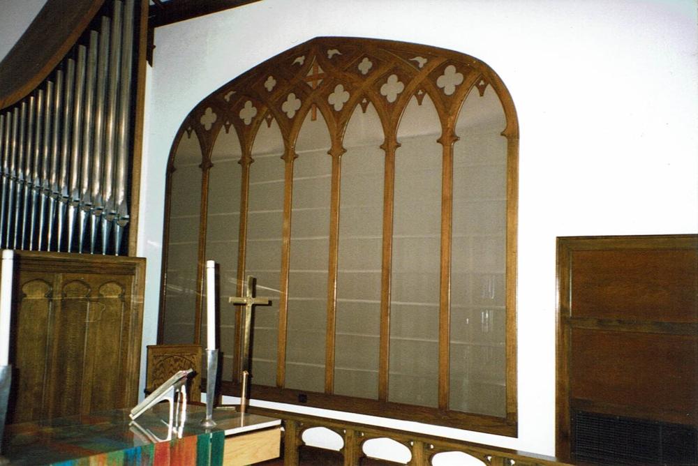 The original Hinners was installed in two side-by-side chambers on the right side of the chancel at the front of the sanctuary. It is not known what - if any - tonal changes or modifications may have been made in the past prior to 1976. The Pedal 16' Bourdon was installed in the Great chamber. In 1976, Balcom and Vaughan Pipe Organs, Inc. of Seattle was hired to rebuild and enlarge the organ. A new, free-standing case housing the Great Principal chorus and Pedal Principal unit was installed in the chancel at the center of the front wall. Original Hinners Great and Swell chests were retained in the original chambers, and other Kilgen-style E-P unit chests built by Balcom and Vaughan were added. Some of the original Hinners pipework was retained.