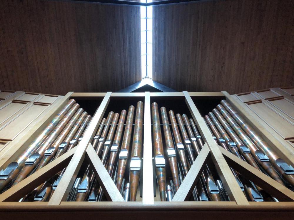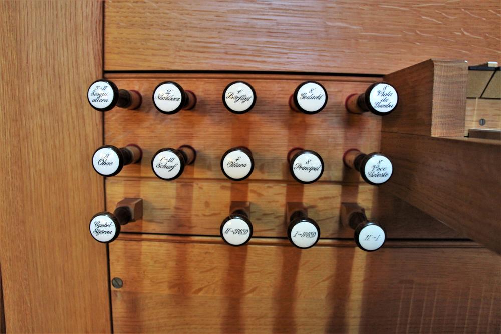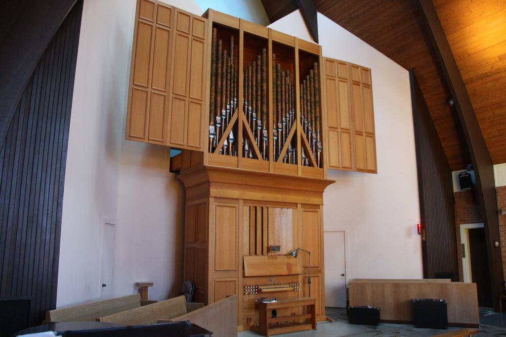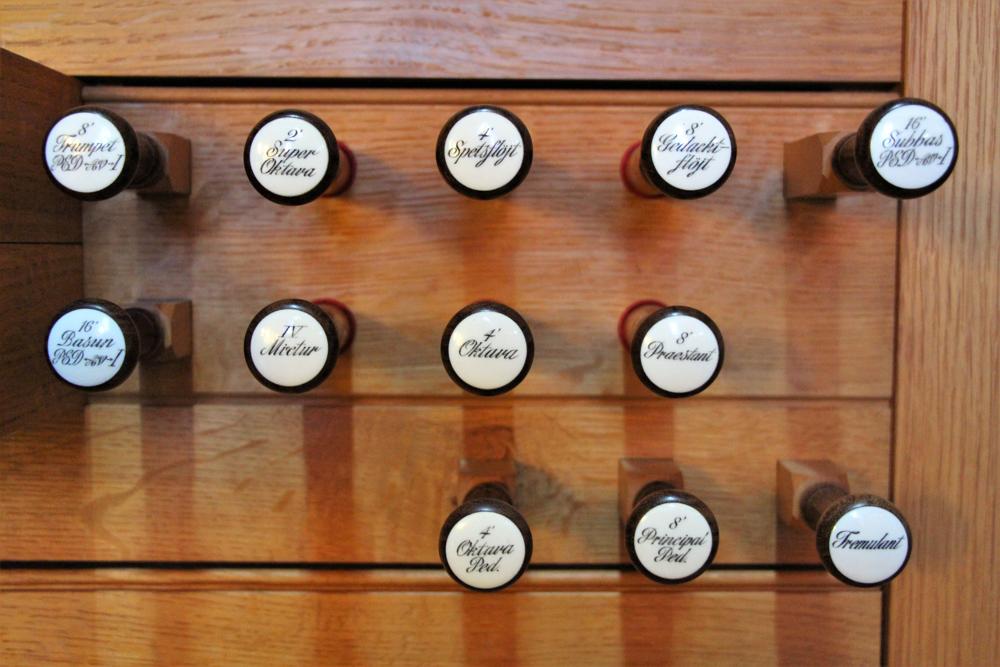 Ped Subbas, Basun, & Trumpet extended fromHovedvaerk. Crescendowaerk. 8' Principal basses shared by Ped. Principal 8'. Wind pressure 75mm. Gedackt and Viola da Gamba share stopped basses. Mechanical capture combination action. 24 Subbas pipes from Hook & Hastings Op. 2316. Manuals have Gabon ebony naturals, plated holly accidentals. Pedals have white oak naturals, holly accidentals.